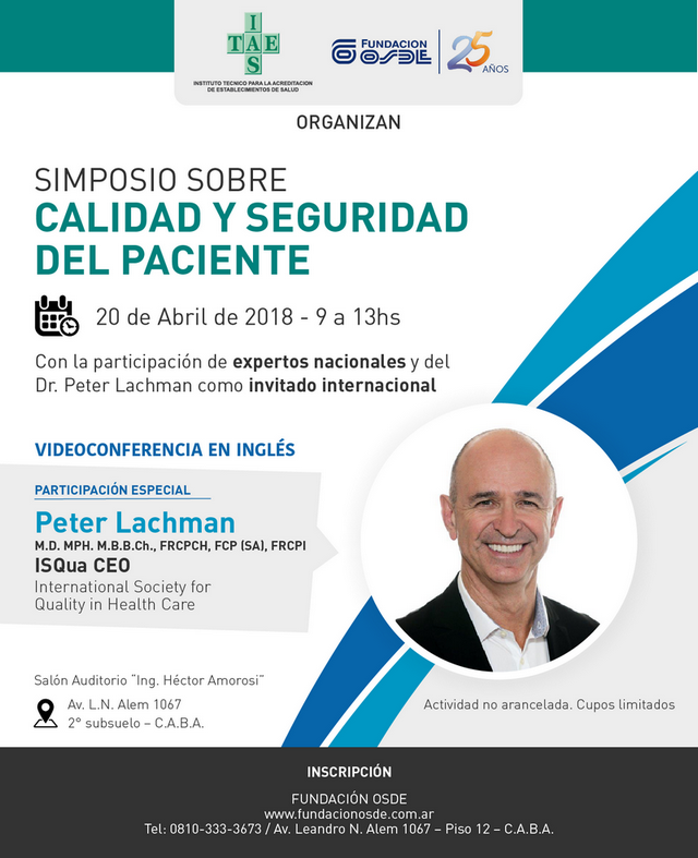 Invitación al Simposio sobre Calidad y Seguridad del Paciente, organizado por la Fundación OSDE y el ITAES 5/4/2018 Invitamos a participar del Simposio, organizado por la Fundación OSDE y el ITAES. Se desarrollará el 20 de abril de 2018, de 9 a 13 horas, en el Salón Auditorio "Ing. Héctor Amorosi". Participarán expertos nacionales y el Dr. Peter Lachman, CEO de la ISQua, como invitado internacional. LA INSCRIPCIÓN SE REALIZA A TRAVÉS DEL SITIO WEB DE LA FUNDACIÓN OSDE.FECHA Y LUGARViernes 20 de abril de 2018 - 9 a 13 horasSalón Auditorio "Ing. Héctor Amorosi"Av. Leandro N. Alem 1067 - 2º subsuelo - Ciudad Autónoma de Buenos AiresTEMARIO- “Acreditación y seguridad del paciente”- “Evaluación del riesgo” - “Seguridad del paciente”- “Impacto de la acreditación en establecimientos de salud”PARA DESCARGAR EL PROGRAMA COMPLETO, HAGA CLICK AQUÍINSCRIPCIÓNActividad no arancelada. Cupos limitados. Se requiere inscripción previa.