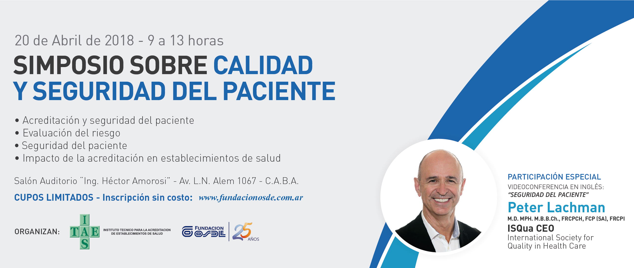 El Simposio sobre Calidad y Seguridad del Paciente se desarrollará el próximo 20 de abril de 2018, de 9 a 13 horas, en el Salón Auditorio "Ing. Héctor Amorosi". Se presentarán destacados expertos nacionales y contaremos con la participación especial del Dr. Peter Lachman, CEO de la ISQua, a través de una videoconferencia en inglés.
